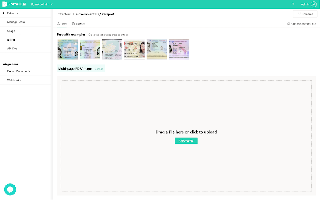 Aside from allowing our users to train their own extractors, FormX has also provided several pre-trained extractors for you to use right away. All you have to do is select the corresponding extractor, test it out with some sample images, and integrate with your software/application via API to easily establish an automated passport/ID cards processing workflow.