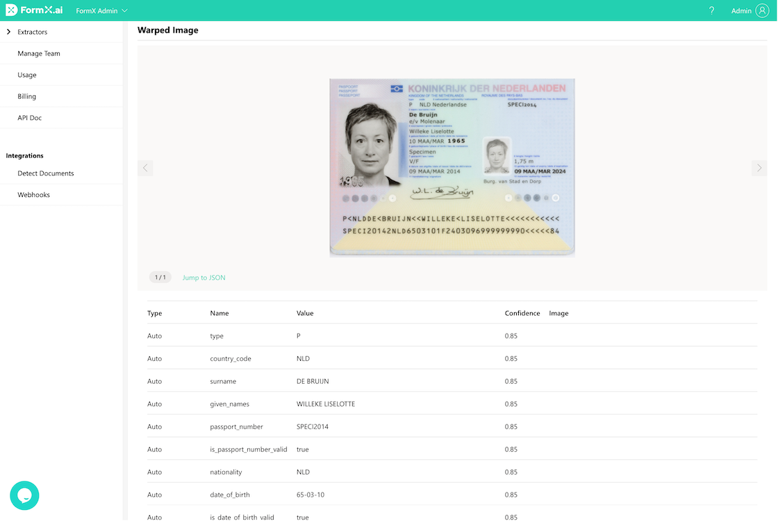 After selecting your extractor, upload a sample image to test it out. You’ll be able to see the result along with the JSON output.