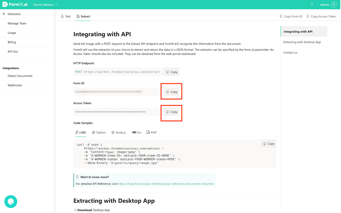 Copy the Form ID and Access Token from the “Extract” tab.