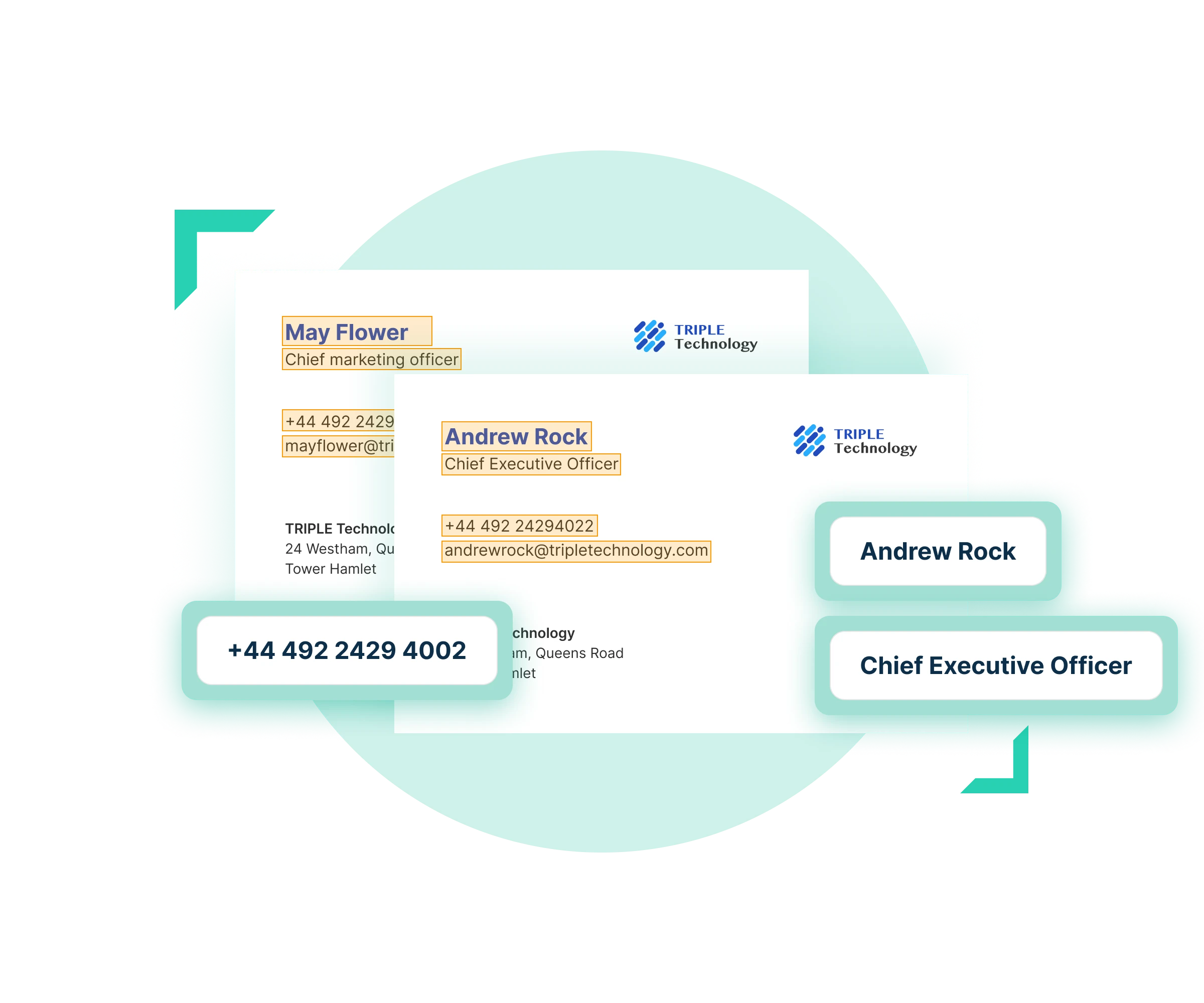 Common data fields that can be extracted using our business card OCR include name, email address, phone number, name of company, and more.
