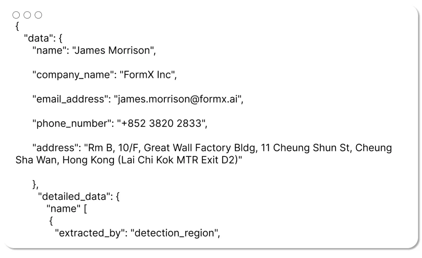FormX leverages machine learning, natural language processing, and large language models to recognize and extract relevant information, including name, phone number, email address, etc., from business card stored as PDF files or images. In contrast with templated-based solutions, FormX can extract data regardless of the formats as it's powered by advanced AI technologies.